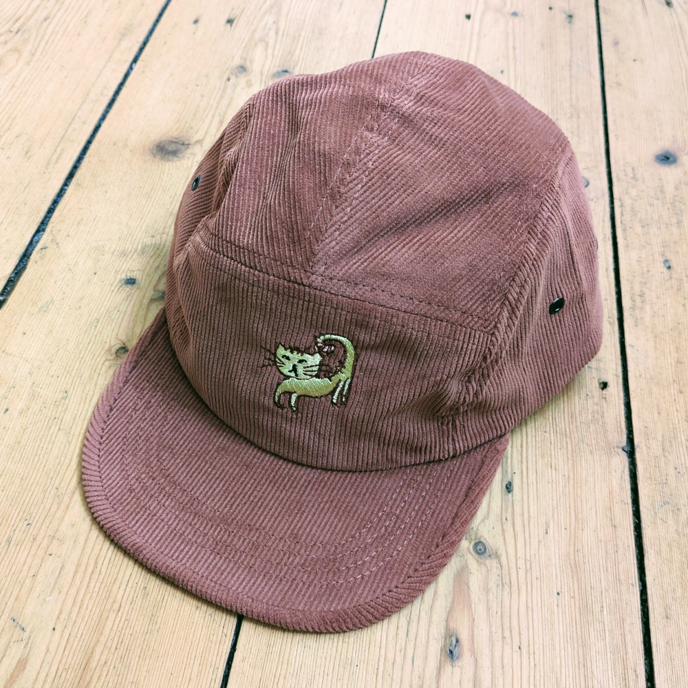Redwood cord cap with embroidered cat design by JY. Beechfield Earthaware Organic Cord Camper Cat in Redwood.