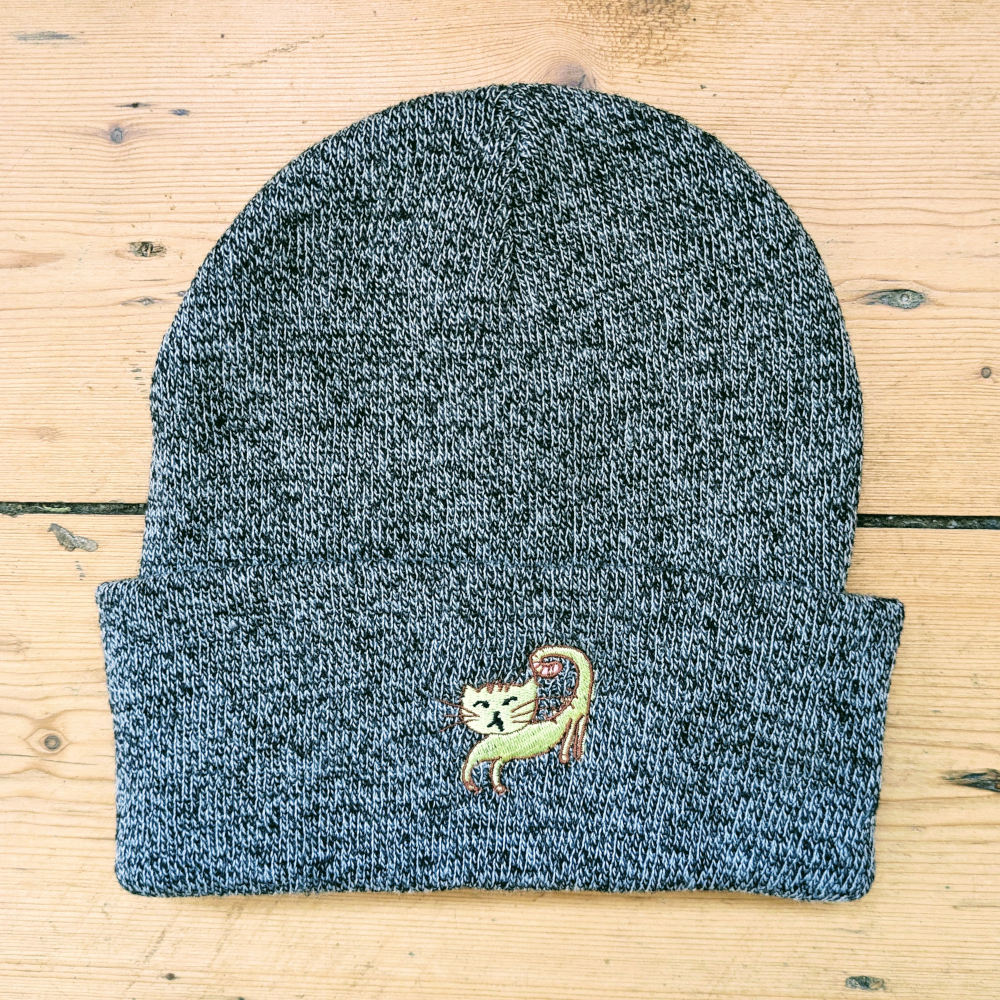 Grey beanie with embroidered cat design by JY. Beechfield Original Cuffed Beanie in Antique Grey.