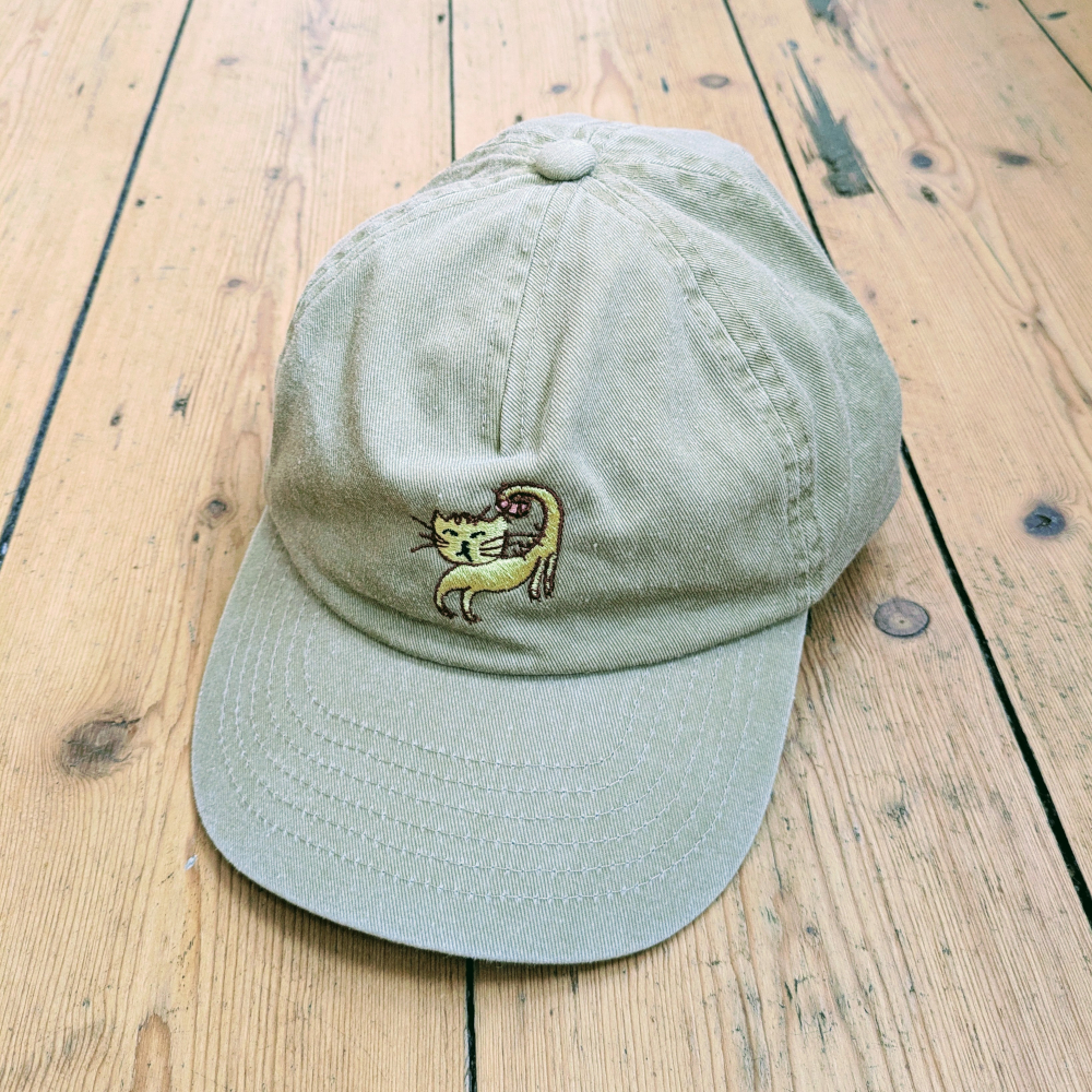 Stone cap with embroidered cat design by JY. Beechfield Relaxed 5 Panel Vintage Cap in Stone.